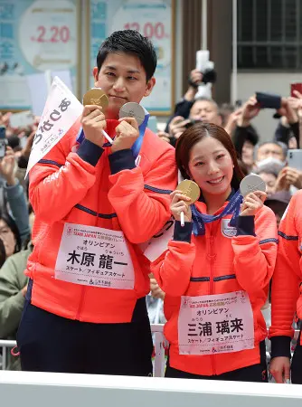 ミラノ・コルティナ冬季五輪・パラリンピックの日本選手団が25日、東京・日本橋で応援感謝パレードを行った。写真は、メダルを手にするフィギュアスケート・ペアの三浦璃来さん(右)、木原龍一さん。【時事通信社】