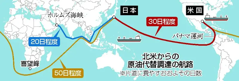 13隻のうち10隻は喜望峰ルートを使う。早ければ1隻が5月初旬にも到着するが、6月に入るとみられるタンカーもある。海運関係者は「時間がかかっても量を選ぶか、通航料を払ってでも早さを選ぶか。荷主のニーズで航路は決まる」と説明した。