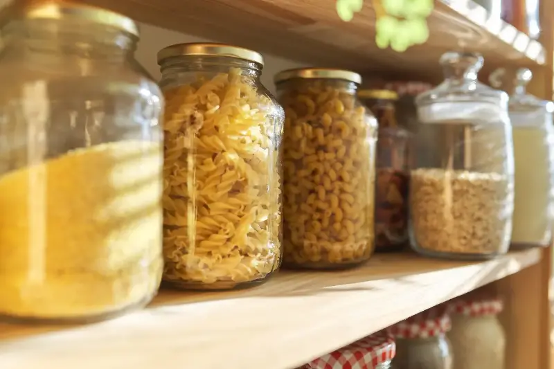 - 透明なストッカーにお米やパスタが並び、ひと目で残量が分かる