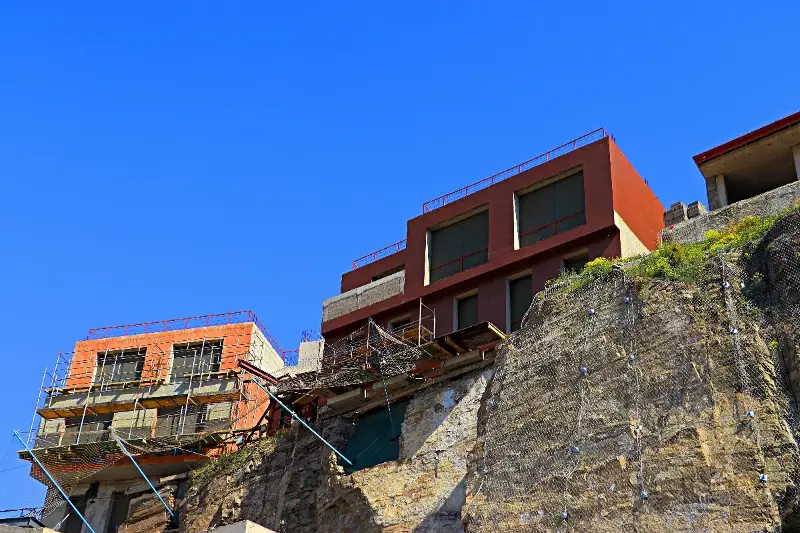 まず、基礎工事が重要です。崖の地盤は周囲よりも不安定な場合があるため、地質調査が必須となります。支持層を確実に見つけ出し、そこにしっかりと杭を打ち込む「杭基礎工法」や、基礎全体を岩肌に沿わせる「岩着基礎工法」などが採用されています。