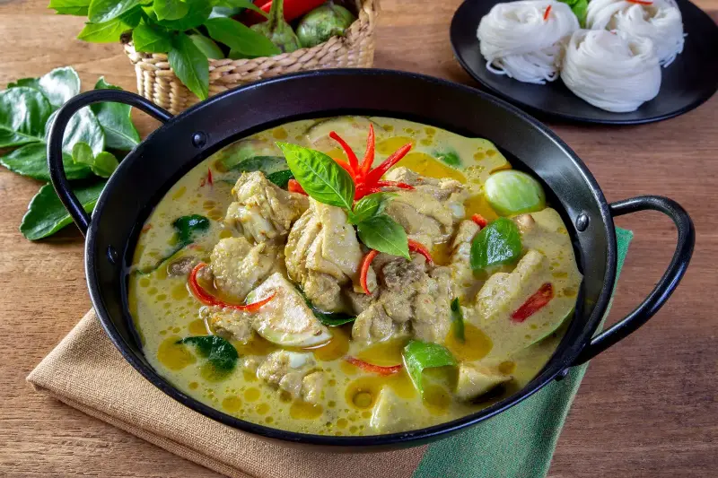 スパイスはグリーンカレーに欠かせない存在です。グリーンカレーペーストの中には、青唐辛子、レモングラス、カフィアライムリーフ、コリアンダーの根、クミン、ガランガルなど、さまざまなスパイスとハーブが使われています。これらのスパイスがカレーに豊かな風味と奥深さ、そしてパンチを与えます。