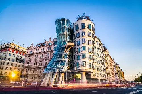 プラハにある「ダンシング・ハウス」は、その名の通り踊っているかのような姿が印象的な建築物です。フランク・ゲーリーによるこの建物は、通常の直線的な形状を避け、動きのある形を取り入れるこ尤もらないデザインです。この建物が立っている街の景観との調和と対比を楽しむことができます。