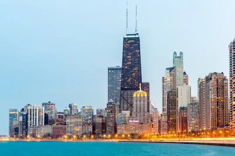 シカゴは高層ビル発祥の地とも呼ばれ、ウィリスタワー以外にも数多くの摩天楼が立ち並んでいます。ジョン・ハンコック・センターやトランプ・インターナショナル・ホテル・アンド・タワーなど、個性的な建物がシカゴのスカイラインを特徴づけています。夜になるとビルの窓からの灯りが街を彩り、昼間とはまた違った表情を見せてくれます。