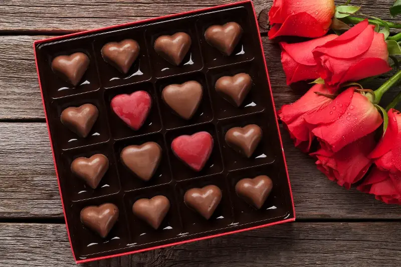 イギリスの伝統は、**「ラブレター」や詩と一緒に贈るチョコレートボックスや焼き菓子。**ベルベットのリボンをほどくと、ほのかにカカオが香り、人の手で紡がれた言葉の温かさが心に残ります。