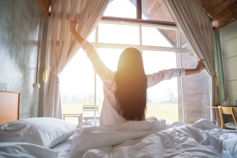 眠気覚ましのコーヒーや冷たい水でリフレッシュするのも良いですが、まずは自然なエネルギー源である朝の日差しを利用することが健康的です。ゆっくり目を閉じて、まぶた越しに柔らかな日差しを感じるだけでも、スッキリ感が違うと感じるでしょう。