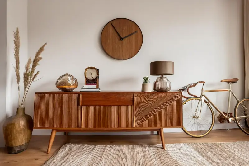 さらに、時計の設置場所によっても印象は変わります。ダイニングテーブルの真上ではなく、入口付近や窓の近く、高さを少しずらすことで空間にリズムが生まれます。また、照明が当たる位置に設置することで陰影が美しく、まるでインテリアオブジェのような存在感を発揮します。