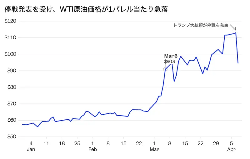 - トランプ大統領がイランとの2週間の停戦を発表した後、原油価格が急落し、株価先物が急騰した。