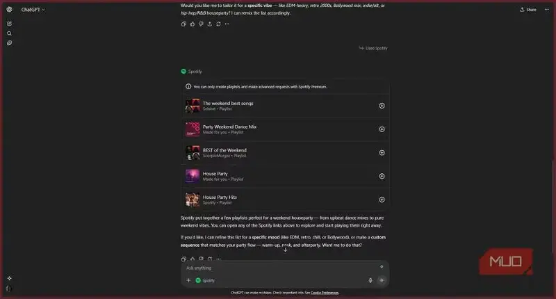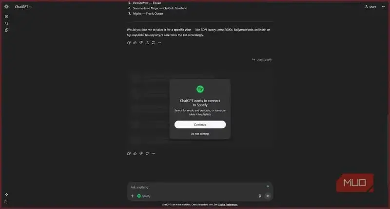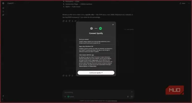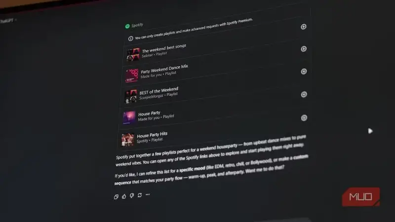 たとえば、ホームパーティー用のSpotifyプレイリスト作成を頼むと、ChatGPTはチャットウィンドウ内にSpotifyを呼び出し、すべての曲をその場でまとめてくれます。旅行の計画でホテル探しを頼めば、ExpediaやBooking.comがチャット内で開き、ChatGPTを離れることなく選択肢を検討できるのです。