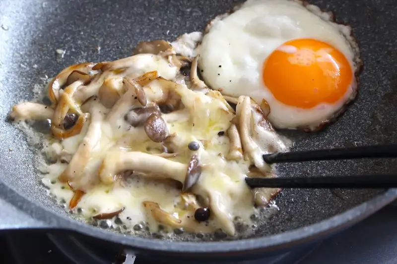 2. 熱したフライパンにバターを落とし、キノコを入れて塩コショウして加熱。その隣に卵を割り入れて目玉焼きを作る。
