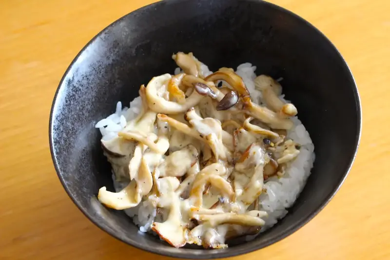 4. チーズがとろけてキノコと一体になったら、ごはんの上に乗せる。